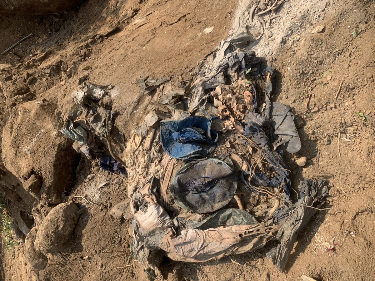Bộ hài cốt liệt sĩ, 2 chiếc mũ tai bèo, dép cao su,... được phát hiện trong lúc thi công đường (Ảnh: H.C)