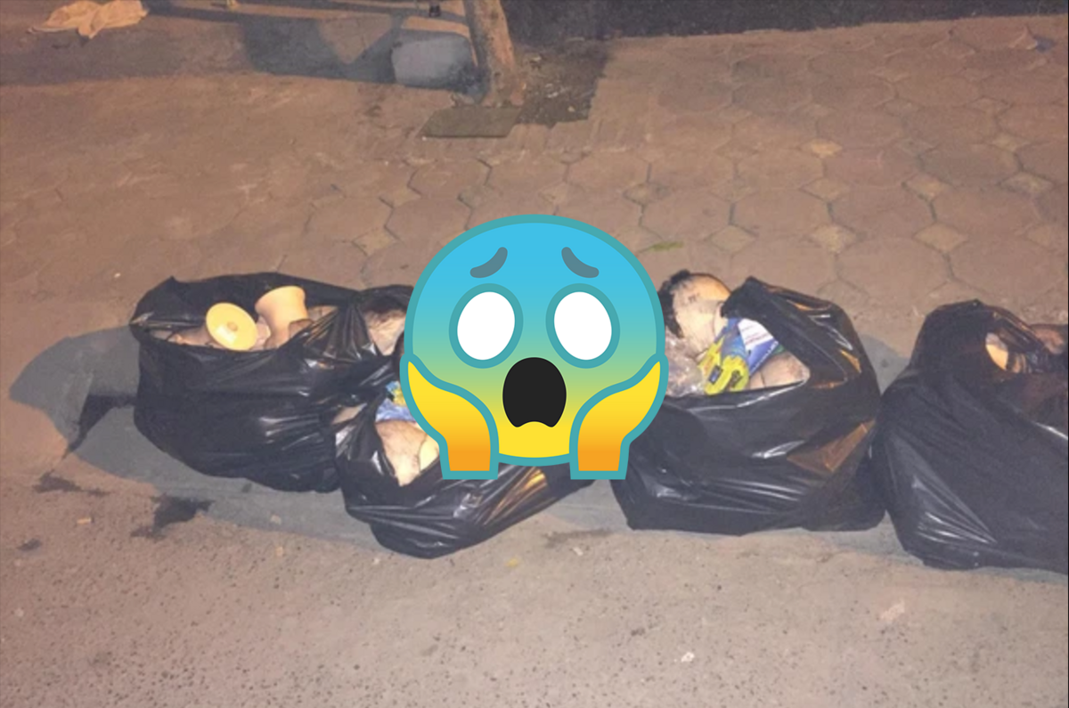 Nhưng vừa ra đến cửa thì gặp cảnh này, 4 chiếc túi đen to đùng đựng đầy những chiếc đầu... ma-nơ-canh khiến bạn trẻ kinh hãi bỏ chạy rơi cả dép. Mãi sau mới trấn tĩnh được mà quay lại chụp ảnh post lên mạng.