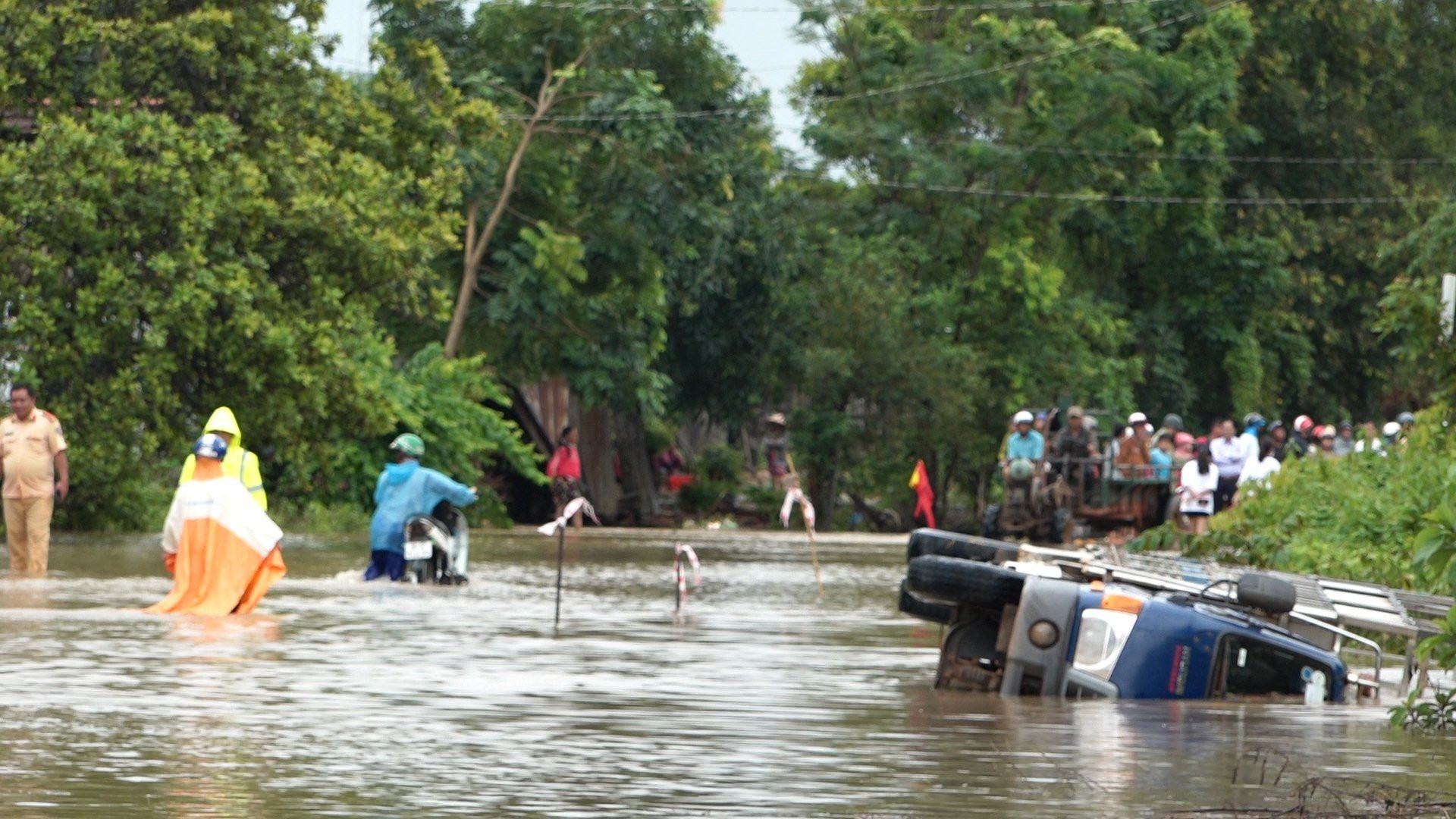 Xe ô tô tải suýt bị cuốn trôi ở Đắk Lắk do gặp dòng nước lũ.