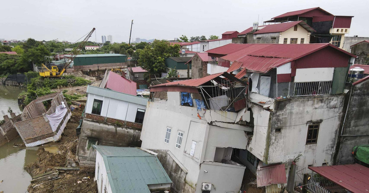 6 ngôi nhà dân ở khu Vạn Phúc, thành phố Bắc Ninh, tỉnh Bắc Ninh đã bị sụt lún xuống sông Cầu, gây thiệt hại lớn về tài sản. (Ảnh: Bảo Khánh)