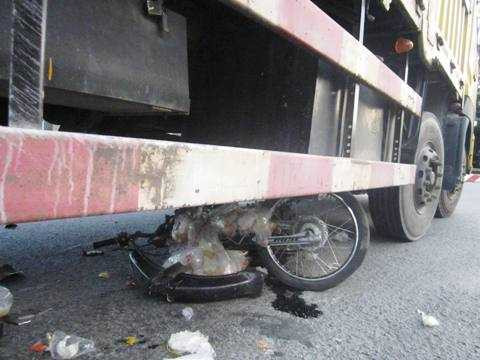 Sau cú va chạm, anh Tài bị xe tải cán ngang qua người, gãy hai chân, chiếc xe máy nằm gọn vào gầm xe tải và kéo lê khoảng 10 mét trên đường.