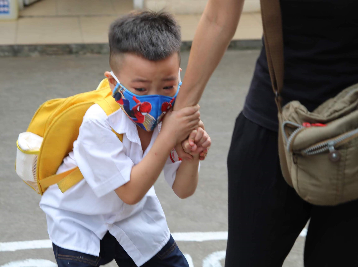 Một bạn học sinh lớp 1C nước mắt nhạt nhoà, không chịu đến trường, mẹ phải dỗ dành đưa vào tận lớp học.