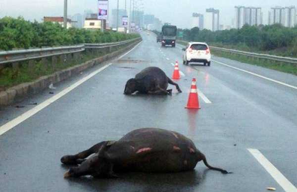 Hai con trâu chết nặng khoảng 200kg được phát hiện nằm giữa đường. Khi nhân viên đường cao tốc đến nơi, xe gây tai nạn đã rời hiện trường.