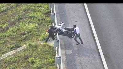Đoạn clip đăng tải ngày 7/2 trên trang Facebook Thông tin đường cao tốc Hà Nội - Hải Phòng ghi lại cảnh 2 thanh niên chật vật bê chiếc xe Air Blade qua tôn lượn sóng trên cao tốc Hà Nội - Hải Phòng.