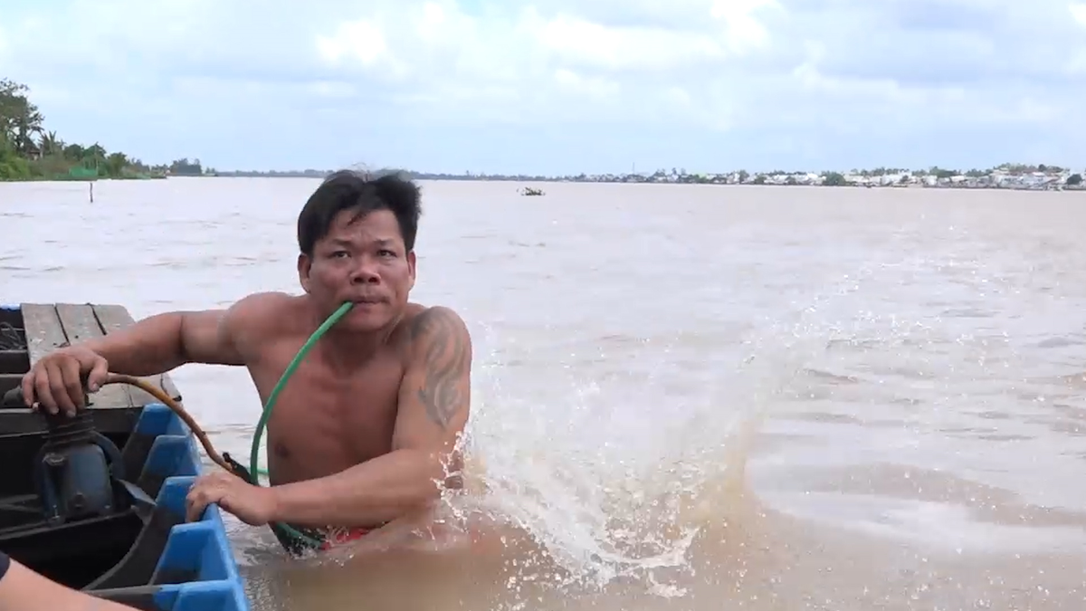 Anh Trần Văn Hiếu (Thanh Bình, Đồng Tháp) dùng ống thở dài 30m và một rổ nhựa bịt kín đeo ở bụng, lặn dưới đáy sông tìm bắt tôm, cá bằng tay không.