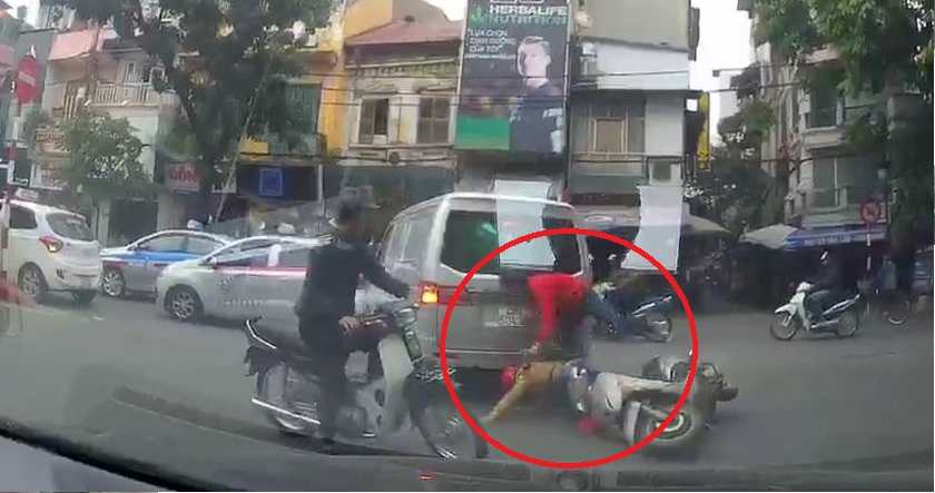 Hai thanh niên điều khiển xe máy đi vào đường ngược chiều, phanh gấp nên ngã đổ kềnh ra đường; sau khi được người dân giúp dựng xe, cả hai lại tiếp tục... đi ngược chiều.