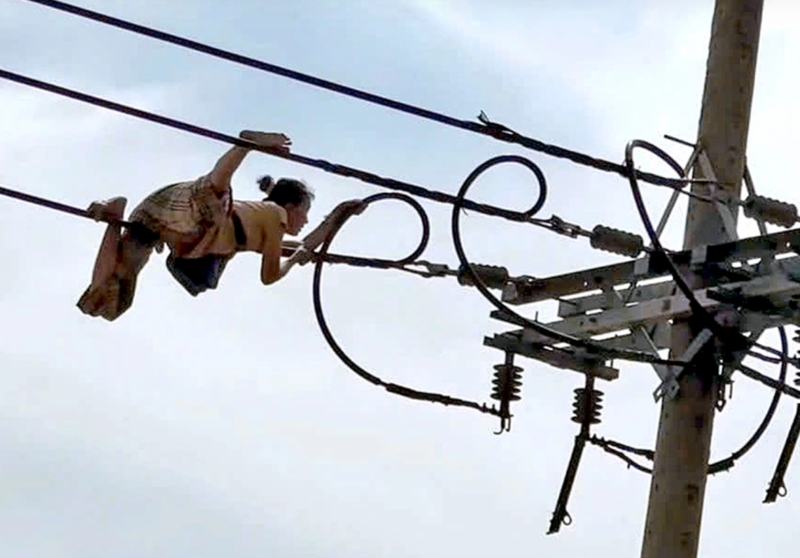 Người phụ nữ đã được người dân đưa xuống, nhưng sau đó lại leo trở lại cột điện. Đến đỉnh cột điện, bà đứng thẳng người và bước đi thăng bằng trên dây, tuy nhiên vừa đi vài bước đã rơi xuống đất, nằm bất động.