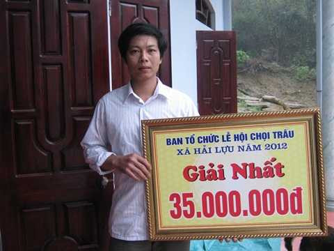 | 'Cao thủ' Nguyễn Văn Thơm với tấm bằng khen đạt giải nhất lễ hội chọi trâu Hải Lựu năm 2012 - Ảnh: Nguyễn Vương |