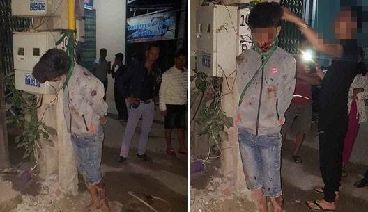 Mới đây, mạng xã hội xuất hiện đoạn clip ghi lại hình ảnh nam thanh niên bị trói tay tay nằm dưới đất, miệng bị thương. Cùng với đó là một số hình ảnh nam thanh niên bị treo cổ lên cột điện cạnh 1 con chó đã chết.
