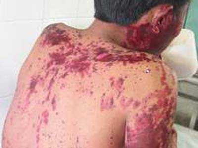 Toàn thân cháu nổi mụn nước to như ngón tay cái, phỏng rộp, tuột da. Sau 10 ngày điều trị, bệnh thêm nặng nên gia đình chuyển cháu đến BV Nhi Nghệ An.