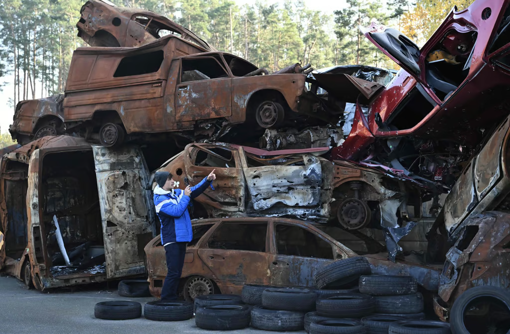 Blasco Ventas tại một nghĩa trang xe hơi ở Irpin, nơi những chiếc xe dân sự bị phá hủy được chất thành đống. (Ảnh: AFP)