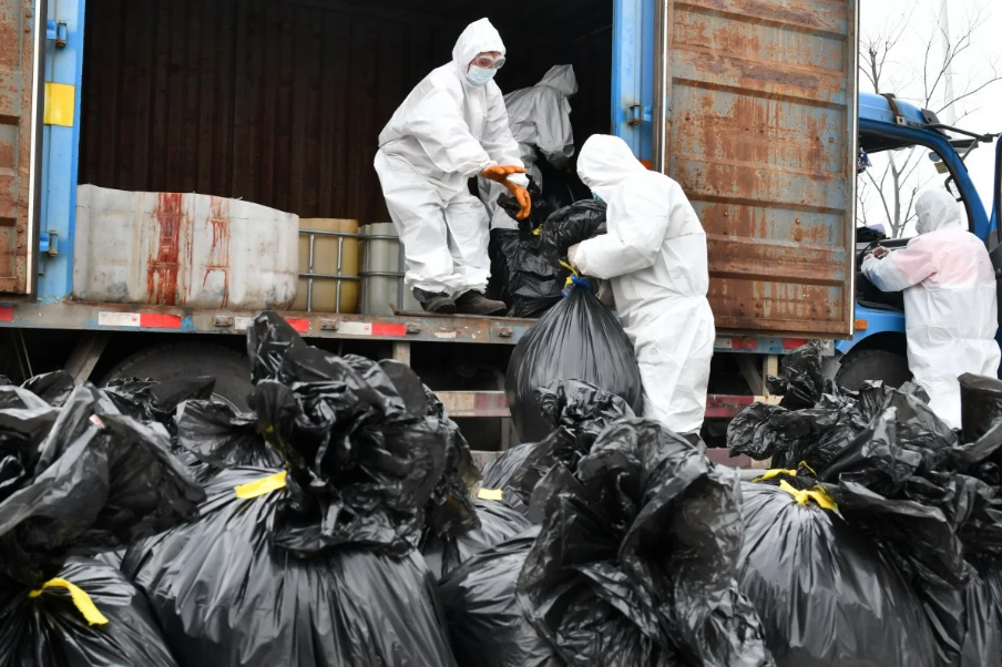 Những núi mặt nạ và bộ đồ bảo hộ nằm la liệt ở khu chứa rác của các bệnh viện trên khắp Vũ Hán. Tờ The Paper cho biết có tới 3 tấn rác thải y tế được thải ra từ Bệnh viện Puren chỉ trong 4 ngày. Những người thu gom rác nói họ bị choáng ngợp và Vũ Hán chưa từng chuẩn bị kịch bản để đối phó với lượng lớn rác thải tới vậy.