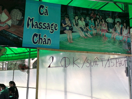 Vốn chỉ xuất hiện trong các spa lớn, nhưng dịp Tết, dịch vụ massage "cá bác sĩ" giá chỉ 20.000 đồng xuất hiện tại hội hoa xuân khiến nhiều người thích thú.Dịch vụ cá massage - vốn chỉ được biết tới ở những trung tâm massage sang trọng - vừa xuất hiện tại công viên Tao Đàn (TP.HCM), trong dịp hội hoa xuân. Một chiếc nhà bạt lớn được dựng lên với những bể cá bên trong khiến rất nhiều người tò mò.
