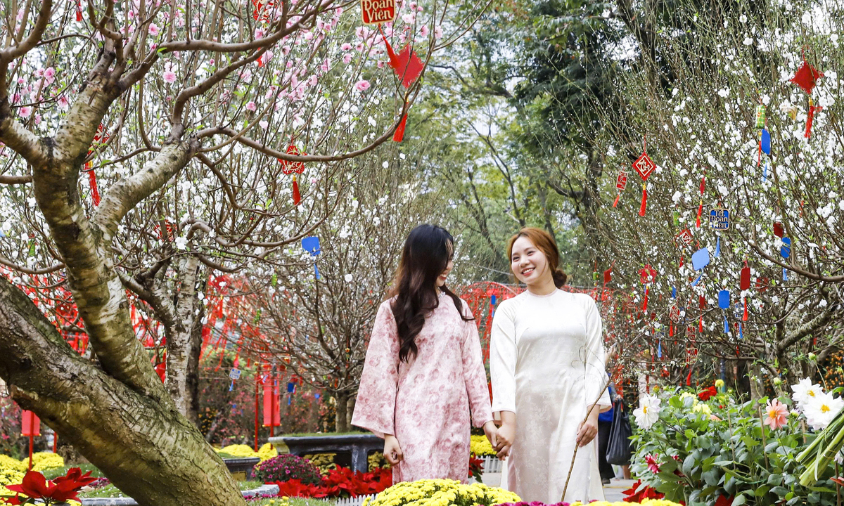 Không gian nổi bật nhất nằm ở Vườn hoa Lý Thái Tổ. Năm nay, khu vực này được đầu tư bài bản hơn với số lượng lớn đào được tuyển chọn kỹ.