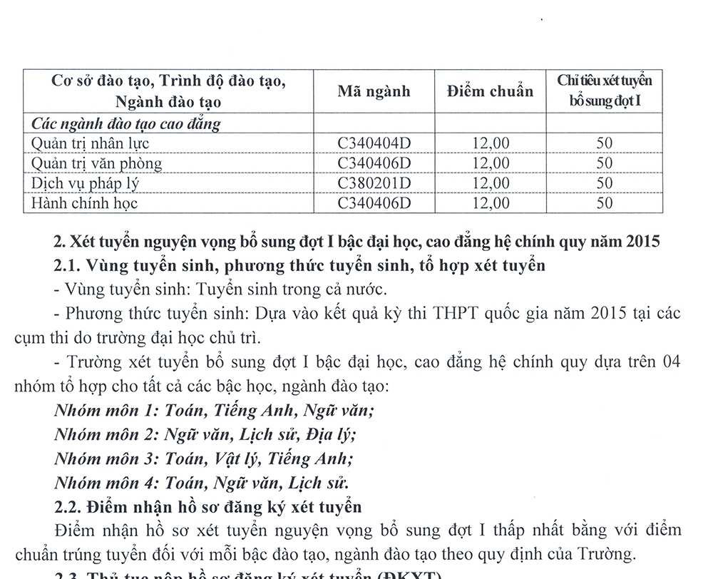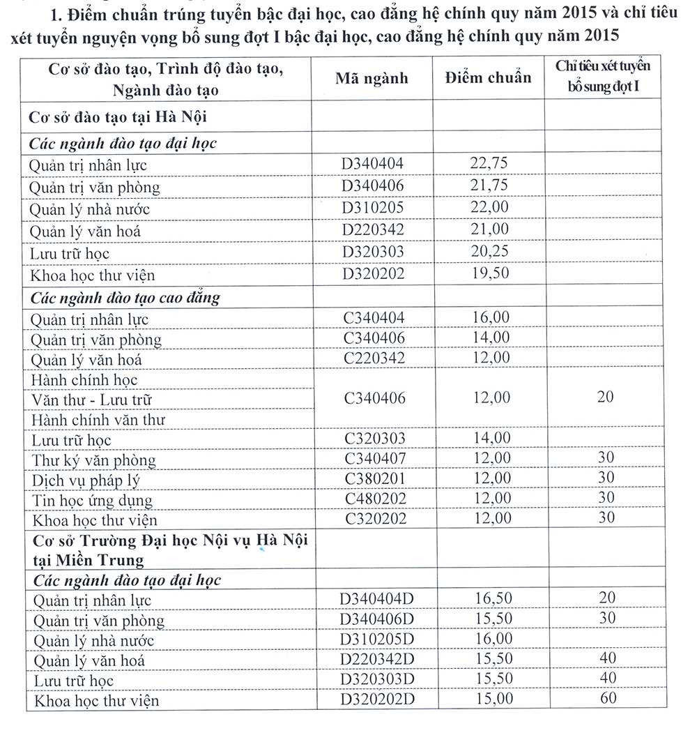 Trong khi đó, trước khi có điểm chuẩn Đại học Nội vụ Hà Nội năm 2016, phụ huynh và thí sinh có thể tham khảo điểm chuẩn Đại học Nội vụ Hà Nội vào các ngành năm 2015 như sau: