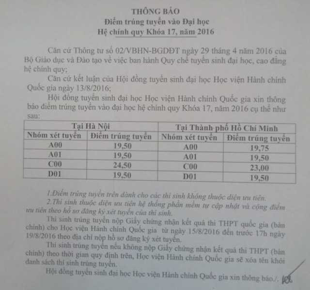 Điểm chuẩn Học viện Hành chính Quốc gia 2016: