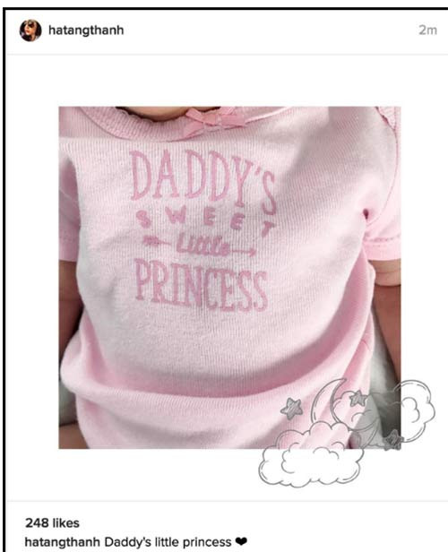 Dù suốt quá trình mang thai cho tới khi hạ sinh công chúa nhỏ, Tăng Thanh Hà khá kín tiếng, thế nhưng chỉ không lâu sau, "ngọc nữ" đã khéo léo chia sẻ hình ảnh chiếc áo hồng xinh xắn với dòng chữ ý nghĩa "Daddy sweet little princess" mà con gái đang mặc như chia sẻ với mọi người tin vui của gia đình. Tuy nhiên như mọi lần, cô vẫn quyết giữ hình ảnh riêng của con cái.