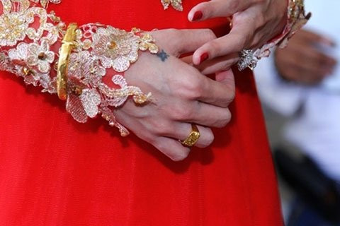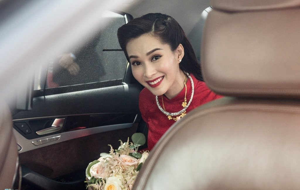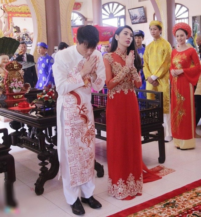 Lễ cưới của Hoa hậu Thu Thảo và doanh nhân Trung Tín được tổ chức vào ngày 6/10 tại TP.HCM. Cô dâu, chú rể được khen đẹp đôi, trai tài gái sắc. Thu Thảo rạng rỡ trong bộ áo dài đỏ, kiểu dáng truyền thống đơn giản của nhà thiết kế Thuận Việt