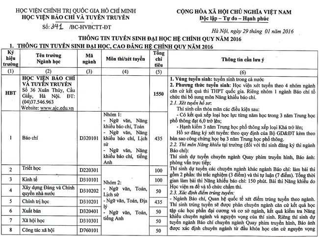 | Thông tin tuyển sinh của Học viện Báo chí Tuyên truyền năm 2016 |