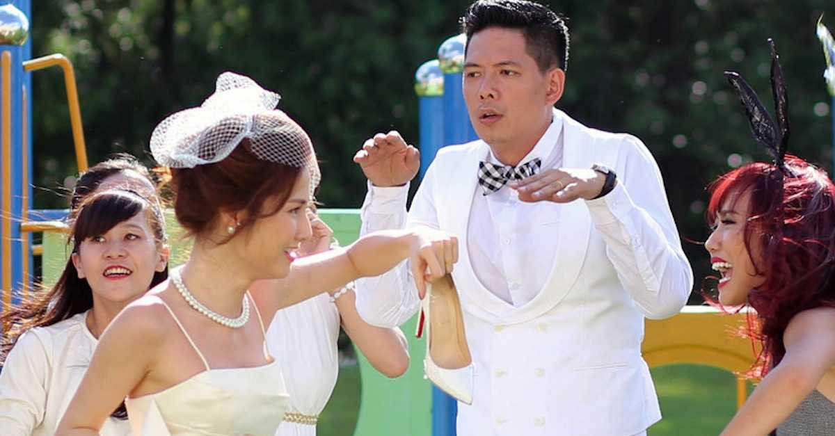 Diễn viên Diễm My 9X xuất hiện gợi cảm, xinh đẹp trong chiếc váy cưới màu trắng nhưng khá nghịch ngợm, thậm chí được nhận xét nhảy 'sung' nhất dàn diễn viên khi xách cả giày cao gót lên để nhảy nhót.
