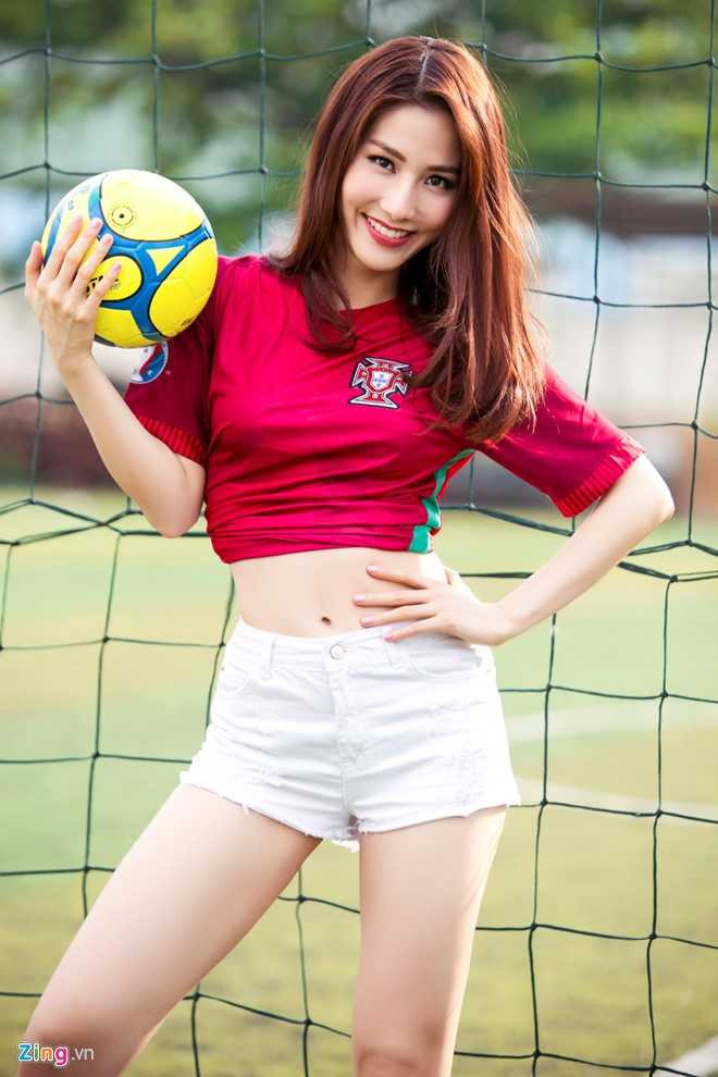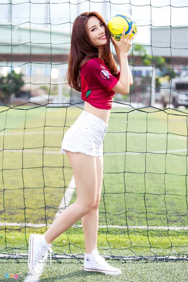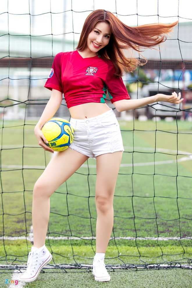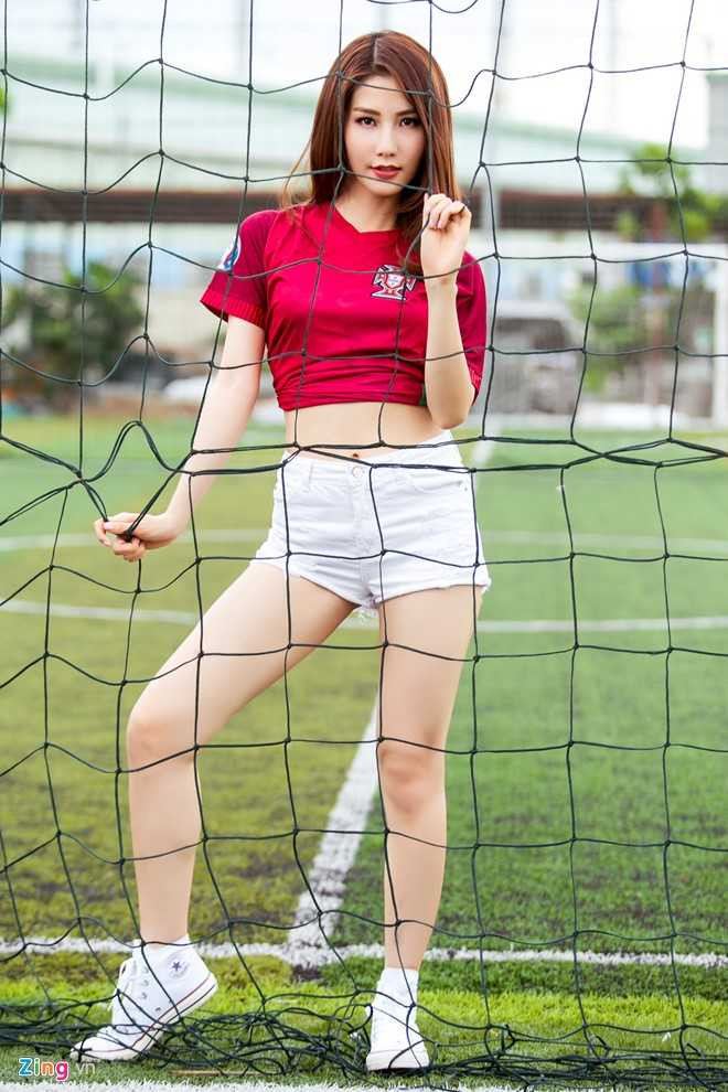 ![]() Diễn viên Tốc độ và đường cong linh hoạt thay đổi tạo dáng để bộ ảnh thêm sinh động, thu hút khán giả yêu thích đội Bồ Đào Nha như cô. |