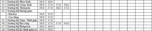 Cụ thể ngưỡng điểm nhận hồ sơ đăng kí xét tuyển vào các trường Đại học, Cao đẳng quân sự năm 2016: