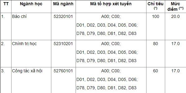 Đại học Khoa học xã hội và nhân văn (Đại học Quốc gia Hà Nội) công bố ngưỡng đảm bảo chất lượng đầu vào dao động từ 17 đến 20 điểm.