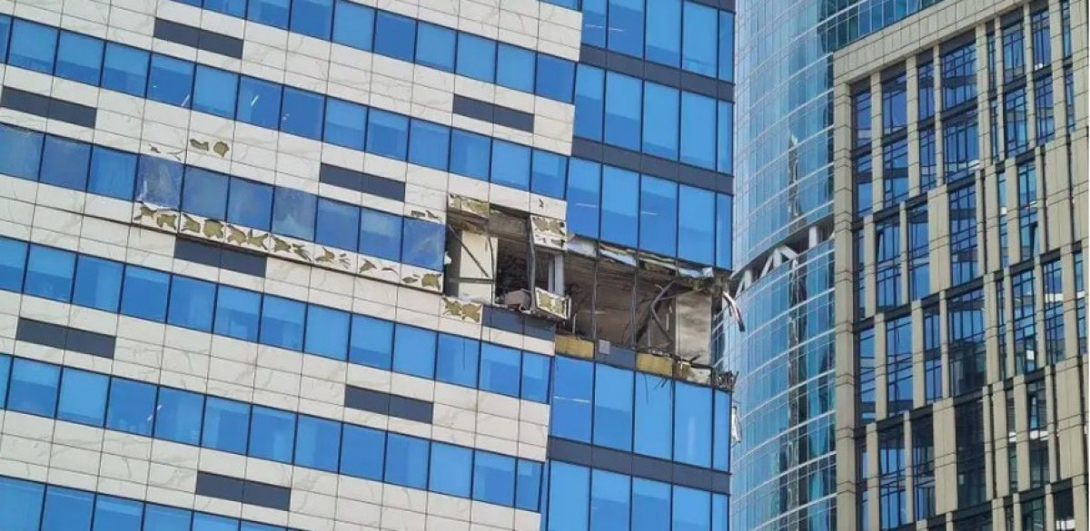 Một phần của tòa nhà tại trung tâm tài chính của Moskva bị phá hủy sau cuộc tấn công UAV. (Ảnh: Getty)