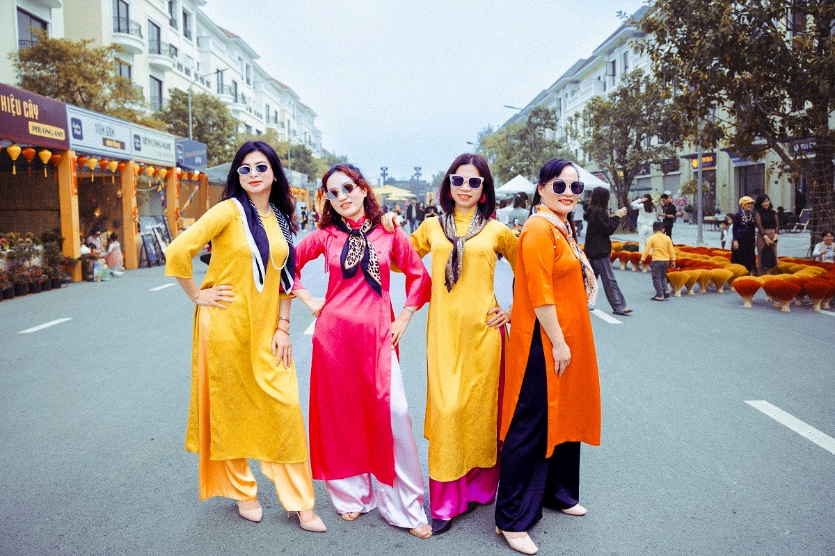 Hội chị em nô nức trong tà áo dài mang phong cách “Cô Ba Sài Gòn” rực rỡ màu sắc, thả dáng trong chợ Tết Vinhomes Ocean Park 2.