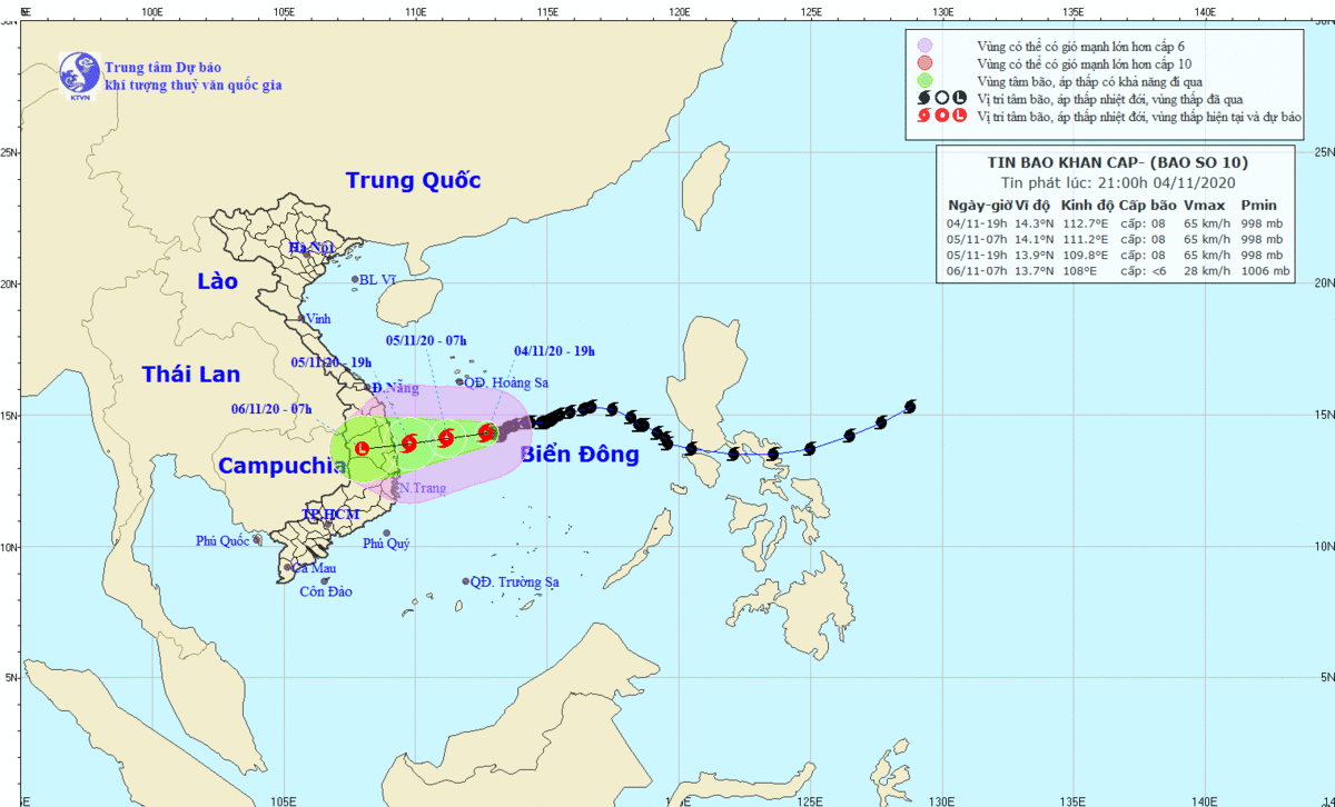 Vào 19h hôm nay (4/11), vị trí tâm bão số 10 ở khoảng 14,3 độ Vĩ Bắc; 112,7 độ Kinh Đông, cách quần đảo Hoàng Sa khoảng 300km về phía Nam Đông Nam. Sức gió mạnh nhất vùng gần tâm bão mạnh cấp 8 (60-75km/giờ), giật cấp 10. Bán kính gió mạnh từ cấp 6, giật từ cấp 8 trở lên khoảng 140km tính từ tâm bão.