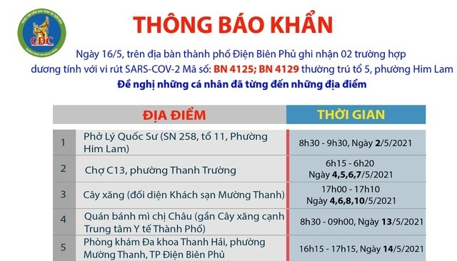 Theo Trung tâm Kiểm soát bệnh tật (CDC) tỉnh Điện Biên, hôm qua (16/5), trên địa bàn TP Điện Biên Phủ ghi nhận 2 trường hợp dương tính với SARS-CoV-2 mã số BN 4125; BN4129, thường trú tại tổ 5 (phường Him Lam, TP Điện Biên Phủ) chưa rõ nguồn lây. CDC Điện Biên đề nghị những cá nhân đã từng đến những địa điểm dưới đây khẩn trương liên hệ các Trạm Y tế gần nhất để được hướng dẫn khai báo y tế.
