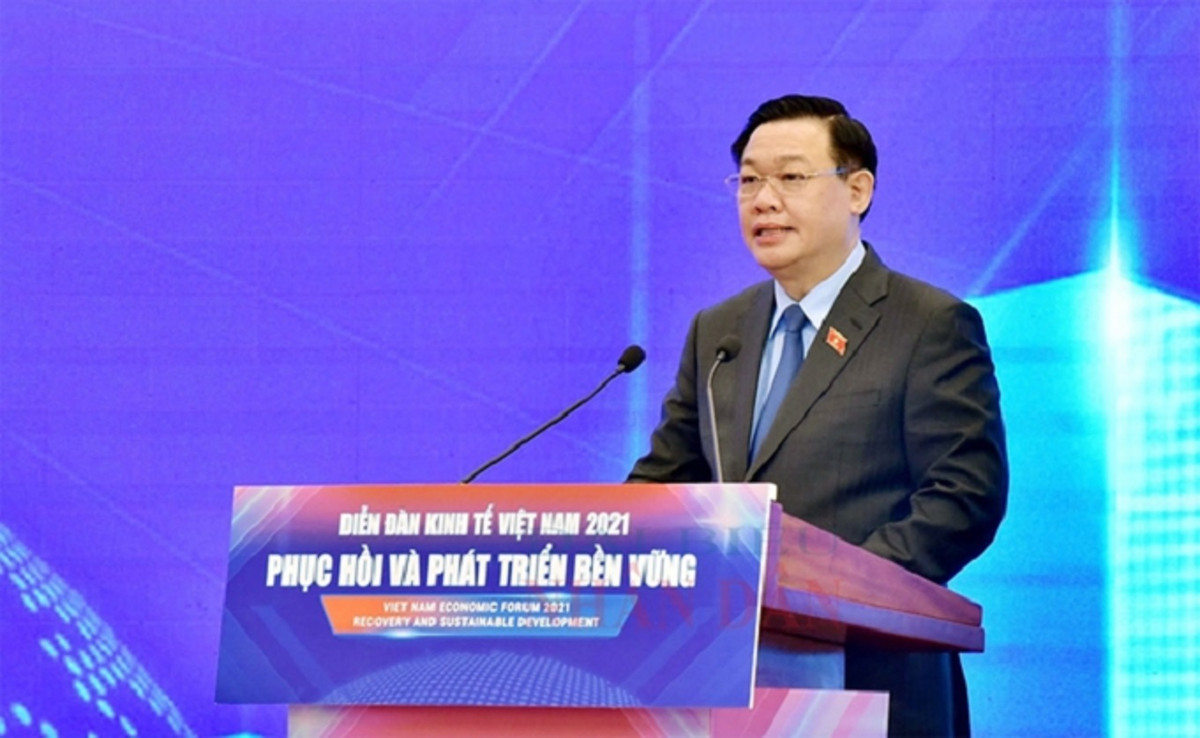 Chủ tịch Quốc hội Vương Đình Huệ phát biểu tại "Diễn đàn Kinh tế Việt Nam 2021: Phục hồi và phát triển bền vững": 9Ảnh: VGP/Nguyễn Hoàng)