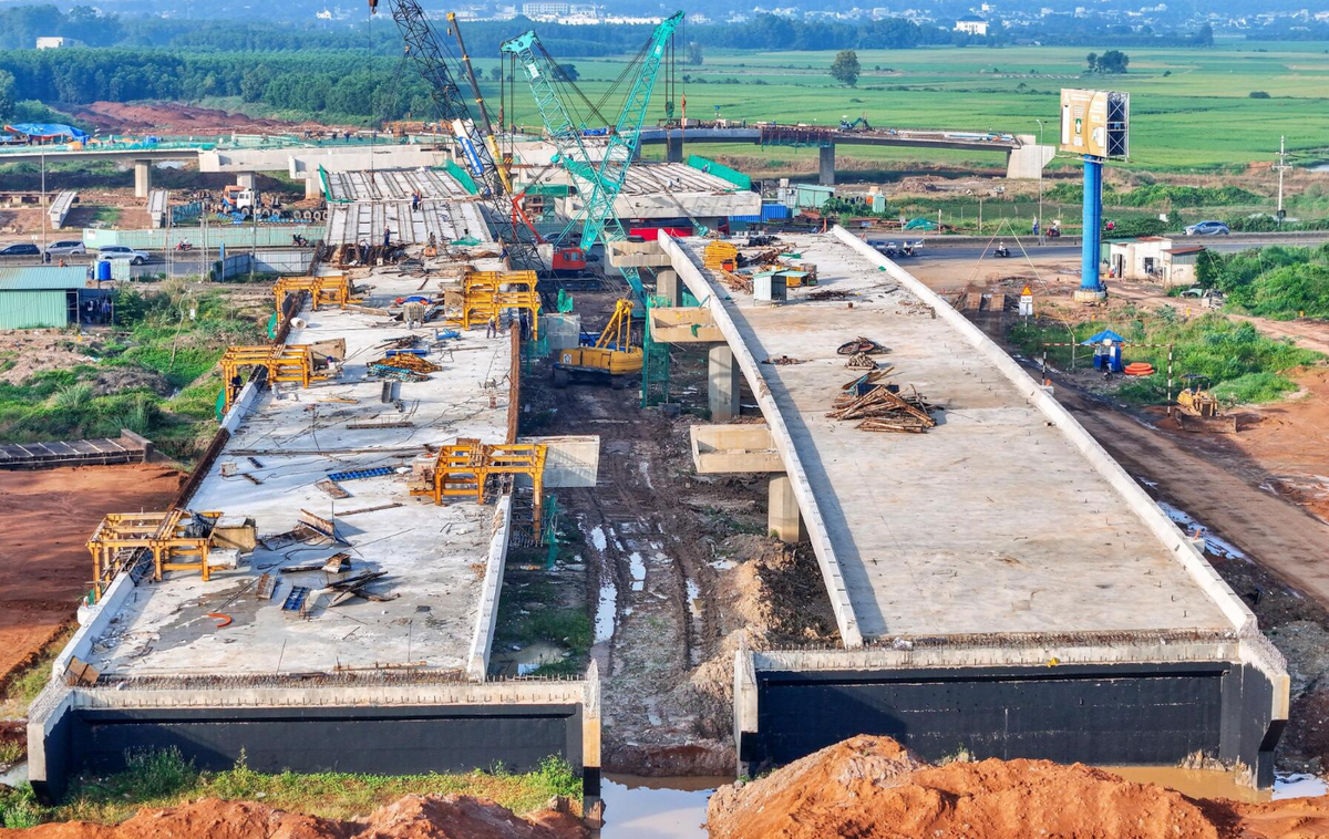Dự án đường T1 - T2 nối sân bay Long Thành được khởi công tháng 7/2023, với tổng kinh phí đầu tư hơn 2.630 tỷ đồng và dự kiến hoàn thành tháng 12/2025.