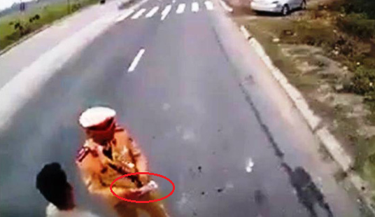 Trong lúc tài xế đưa giấy tờ thì người mặc cảnh phục CSGT tiến tới cầm, từ trong số giấy tờ này rơi xuống đường một vật nghi là tiền. Ngay lập tức, người mặc đồ CSGT đã dùng chân dẫm lên, đồng thời đưa giấy tờ lại cho tài xế xe. Sau đó cúi xuống nhặt vật nghi là tiền rồi đi vào vệ đường.