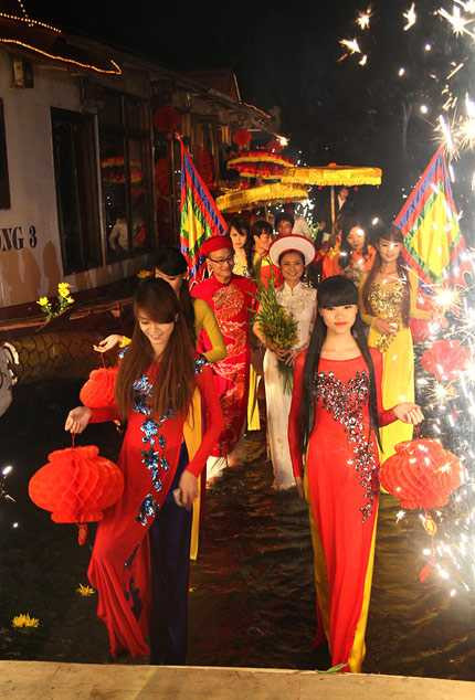 Nhiều bạn bè, người thân đến dự đám cưới Diệu Hương tối 27/12 đều bất ngờ khi cô dâu - chú rể bước xuống từ thuyền rồng.Tối qua (27/12), đám cưới của diễn viên Diệu Hương đã diễn ra tại khách sạn Thắng Lợi (Hà Nội) trong tiết trời lạnh của mùa đông. Chú rể Ngọc Linh từng là phóng viên văn hóa của một tờ báo nên rất giữ gìn những nét đẹp văn hóa quê hương. Trong ngày hạnh phúc của mình, anh đã cùng mọi người trang trí để cả không gian của đám cưới tràn ngập bản sắc dân tộc. Con đường dẫn vào khu vực làm lễ được tân lang, tân nương bày rất nhiều hoa đào, hoa cúc và chữ "Song Hỉ" cũng được treo khắp nơi. Nhiều vị khách đều ngạc nhiên khi biết hai nhân vật chính của đám cưới sẽ xuất hiện từ chiếc thuyền rồng ở Hồ Tây. Đây là ý tưởng độc đáo của chú rể Ngọc Linh. Trước giờ "hoàng đạo", cặp đôi và rất nhiều phù dâu trong trang phục áo dài ngồi trên thuyền rồng và từ từ tiến vào địa điểm làm lễ. Pháo sáng được bắn tưng bừng khi Diệu Hương - Ngọc Linh đi trên chiếc cầu ngập nước. Khung cảnh lãng mạn này khiến không ít người trầm trồ. Nụ cười hạnh phúc rạng ngời trên gương mặt đôi vợ chồng trẻ. Trước đám cưới, cả hai đã tổ chức lễ ăn hỏi ở Nam Định - quê của cô dâu. Là đạo diễn cho màn rước dâu bằng thuyền rồng nên Ngọc Linh phải đeo tai nghe để "chỉ đạo" mọi người. Khi thuyền đã cập bến, Diệu Hương nhắc ông xã tháo tai nghe để chuẩn bị cho nghi lễ tiếp theo. Quen nhau gần nửa năm trong công việc, cả hai dành trọn trái tim cho nhau lúc nào không hay. Chỉ 2 ngày sau lời tỏ tình, Diệu Hương đã quyết định lên xe hoa ở tuổi 27. Từng trải qua nhiều cuộc tình nhưng với riêng diễn viên "Cầu vồng tình yêu", ông xã là người khiến cô cảm thấy bình yên nhất. Không chỉ hạnh phúc vì cùng nhau xây tổ ấm mà Diệu Hương cũng sắp được làm mẹ khi đã mang thai được 3 tháng. Đôi vợ chồng dù chưa biết giới tính của con nhưng đã đặt tên bé là Chuối Đậu. Tân lang, tân nương cùng bố mẹ làm lễ hằng thuận dưới sự chúc phúc của các vị sư. Giờ phút cầu nguyện, Diệu Hương không cố nén những giọt nước mắt hạnh phúc bởi cô đã mơ ước đến ngày này từ lâu. Sau đám cưới, Diệu Hương sẽ tạm xa các hoạt động phim ảnh trong một thời gian để sinh con và vun vén cho gia đình. Thời gian tới, Diệu Hương tạm xa các hoạt động phim ảnh để sinh con và vun vén cho gia đình. Cô sẽ trở lại màn ảnh khi có kịch bản phù hợp.