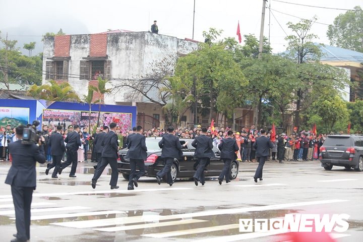 Dàn cận vệ trong trang phục vest đen, cà vạt sọc xanh trắng, đeo huy hiệu Triều Tiêu chạy theo hộ tống chiếc limousine bọc thép chở lãnh đạo Kim Jong-un tại ga Đồng Đăng tiếp tục thu hút sự chú ý của truyền thông.