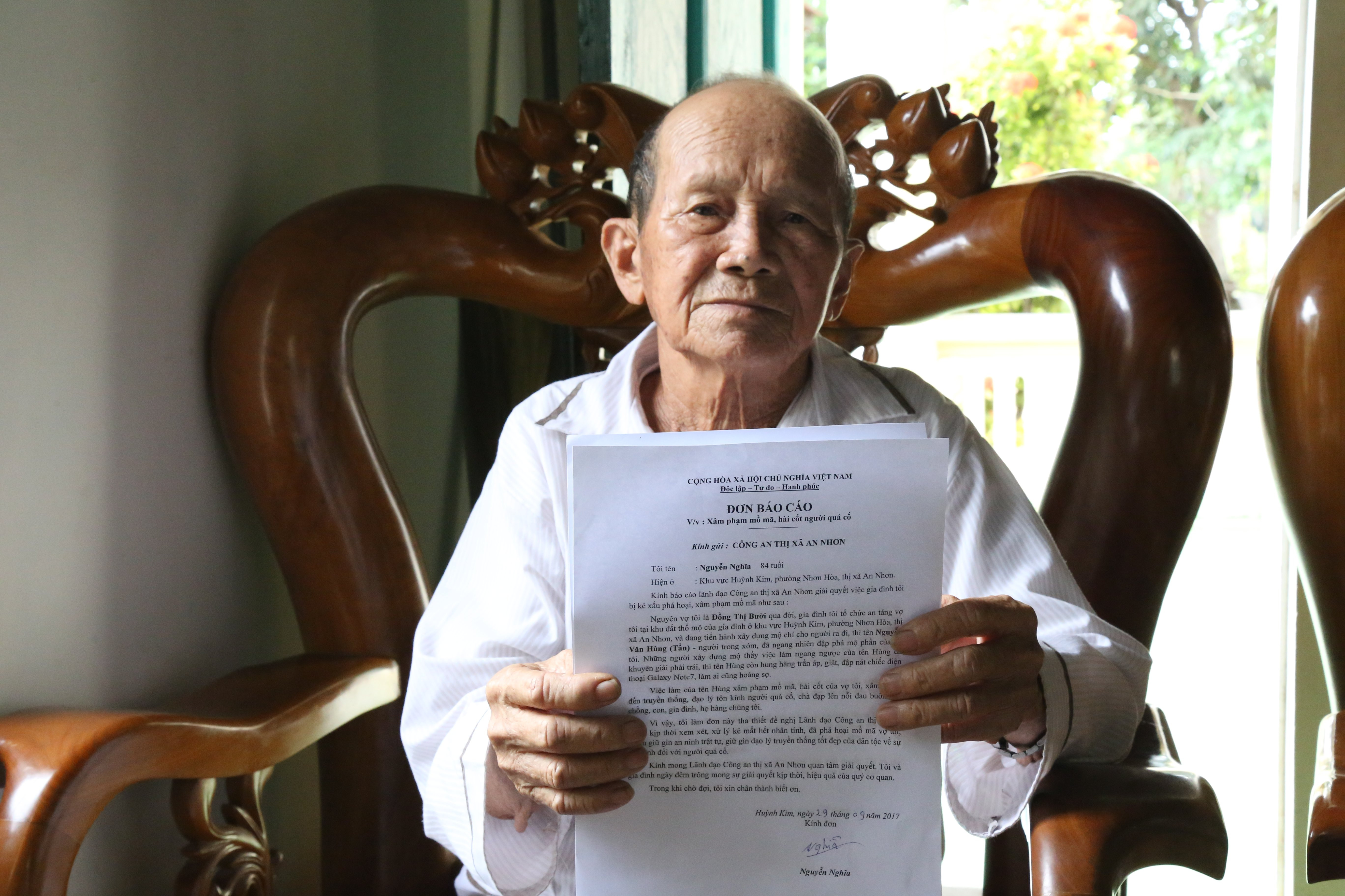 Theo đơn tố cáo, ngày 29/9, trong lúc gia đình ông Nguyễn Nghĩa (84 tuổi, trú khu vực Huỳnh Kim, phường Nhơn Hòa, thị xã An Nhơn) đang xây dựng ngôi mộ cho bà Đ.T. B vừa qua đời. Lúc này, một người đàn ông tên Nguyễn Văn Hùng (trú cùng địa phương) đến khu vực xây dựng ngôi mộ đập phá và cản trở, hù dọa những người thợ khiến nhiều người hoảng sợ.