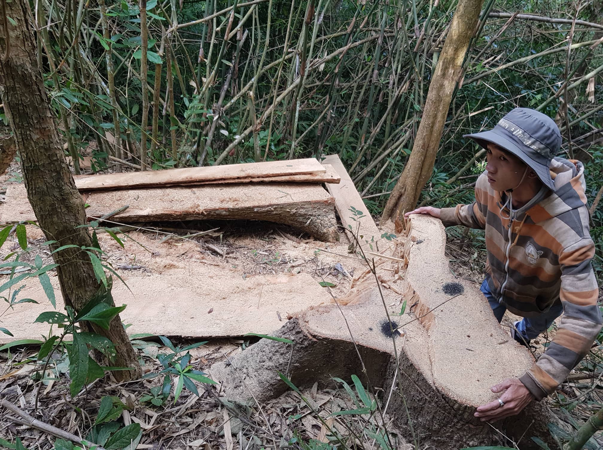 Dọc theo đường vào rừng đặc dụng, cơ quan chức năng còn phát hiện 13 cây gỗ các loại bị chặt hạ. Tổng khối lượng lâm sản bị khai thác tại hiện trường là 41,267m3, chủng loại nhóm III đến nhóm VIII. Công an cũng phát hiện lâm tặc dùng trâu kéo, máy tời để vận chuyển gỗ ra khỏi bìa rừng và để lại nhiều bìa gỗ, lóng gỗ, cành, ngọn... không còn giá trị khai thác tại hiện trường.