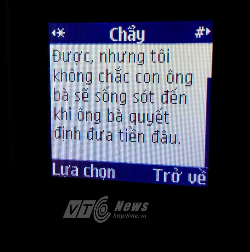 Không gọi được, anh Nguyên nhắn tin nói gia đình chưa đủ tiền, chờ vay mượn. Kẻ giữ máy liên hồi đe dọa: "Được, nhưng tôi không chắc con ông bà sẽ sống sót đến khi ông bà quyết định đưa tiền đâu", "Đàn em tôi không rảnh mà cho nó ăn uống như ông bà. Đừng dại dột. Công an không giúp gì được ông bà đâu. Tôi nhắc lại, chỉ cần công an đi theo thì ông bà sẽ nhận xác nó".