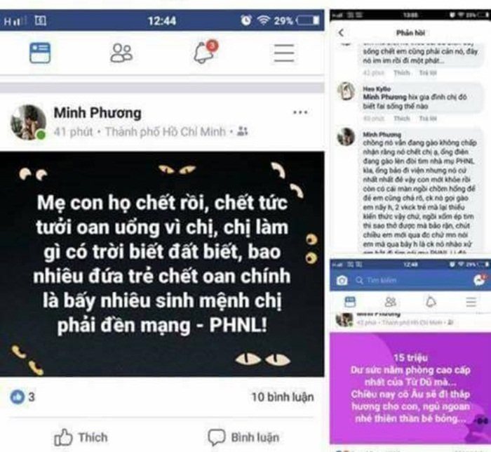 Tài khoản Minh Phương viết: "Mẹ con họ chết rồi, chết tức tưởi oan uổng... Đóng 15 triệu học cái khóa sinh thuận tự nhiên gì đó rồi đòi đẻ ở nhà như Tây. Nhưng bên Tây người ta có bác sĩ, còn Việt Nam mình không có. Mẹ không có sức rặn chết vì kiệt sức, con chết ngạt, đi cả 2 mẹ con...".