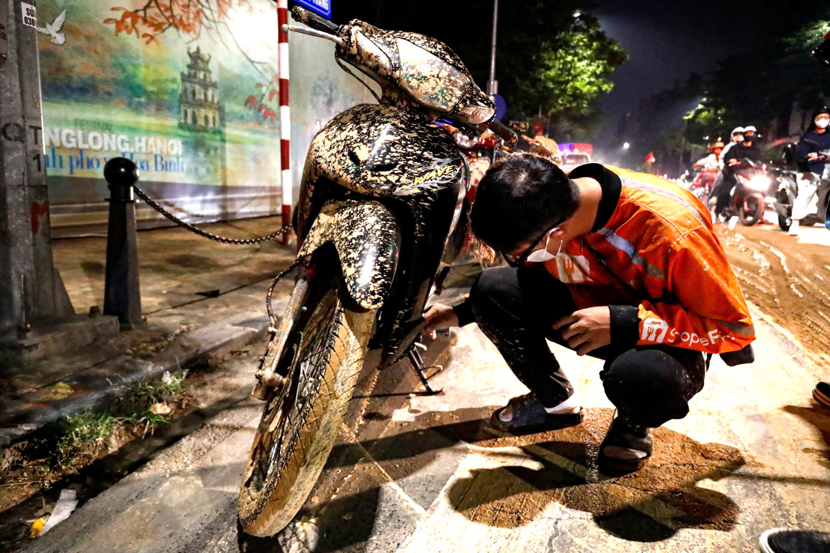 Trước đó, đêm 16/11, hàng loạt người đi xe máy ngã ra đường vì lớp bùn dày tại khu vực ngã tư Tôn Đức Thắng - Nguyễn Thái Học (phường Văn Miếu - Quốc Tử Giám).