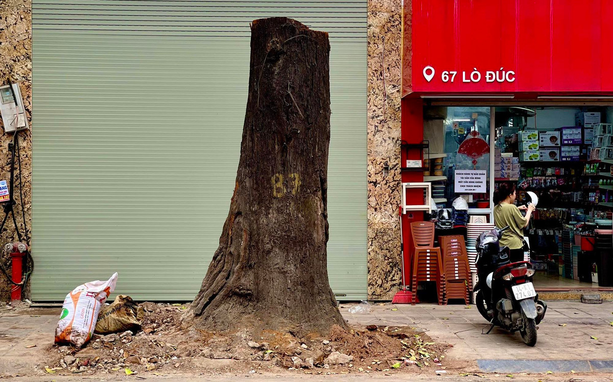 Cây sao đen trước nhà số 65 đã bị chặt hạ, chỉ còn trơ trụi gốc.