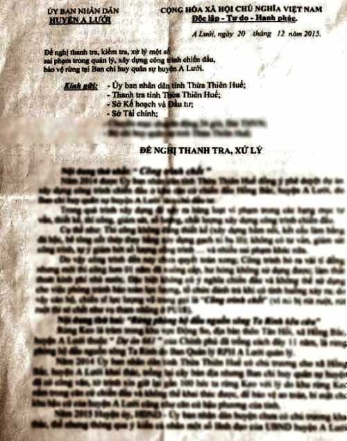 Trước đó ngày 13/3 VTC News có đăng tải bài viết: “Mạo danh chánh văn phòng huyện gửi văn bản đề nghị thanh tra sai phạm”. Bài viết phản ánh về việc một số cơ quan chức năng tỉnh Thừa Thiên - Huế cùng các cơ quan báo đài trên địa bàn tỉnh này nhận được một văn bản ghi nội dung tố cáo về việc thanh tra, kiểm tra, xử lý sai phạm trong quản lý xây dựng công trình chiến đấu, bảo vệ rừng tại Ban chỉ huy quân sự A Lưới.