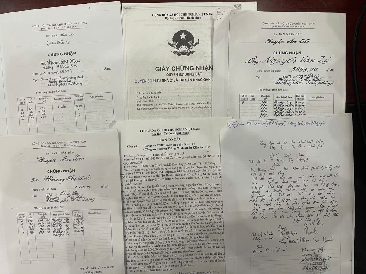 Bà Nguyễn Thị Lạnh (sinh năm 1963, trú tại xã An Lão, TP Hải Phòng), cho biết bìa đỏ đất ruộng của gia đình mang tên bố đẻ là ông Nguyễn Văn Lý (đã chết) có diện tích 5.853m², trong đó phần của gia đình bà Lạnh chỉ được hưởng là 1.800m² nhưng hiện nay lại bị làm giả giấy tờ viết tay với nội dung gia đình bà bán toàn bộ 5.852m² cho bà Nguyệt.