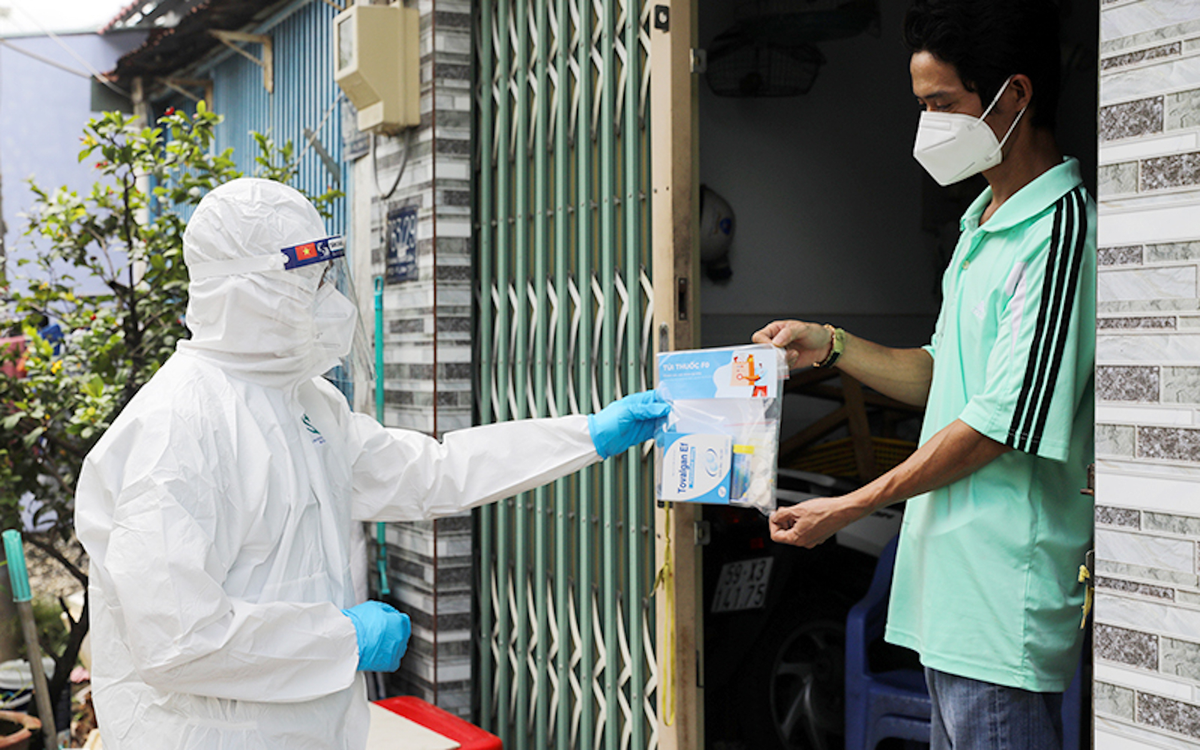 Nhân viên y tế cấp phát thuốc cho người mắc COVID-19 điều trị tại nhà. (Ảnh minh hoạ: SKĐS)