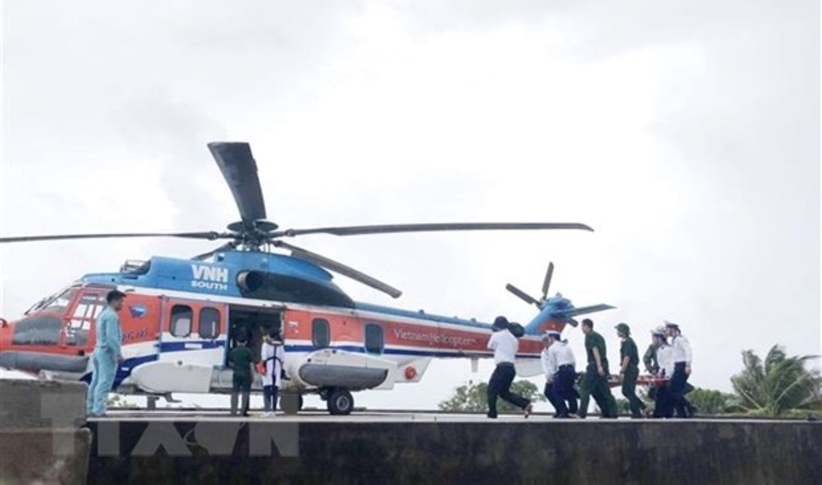 Đưa bệnh nhân từ đảo lên trực thăng về đất liền cấp cứu, điều trị. (Ảnh TTXVN phát).