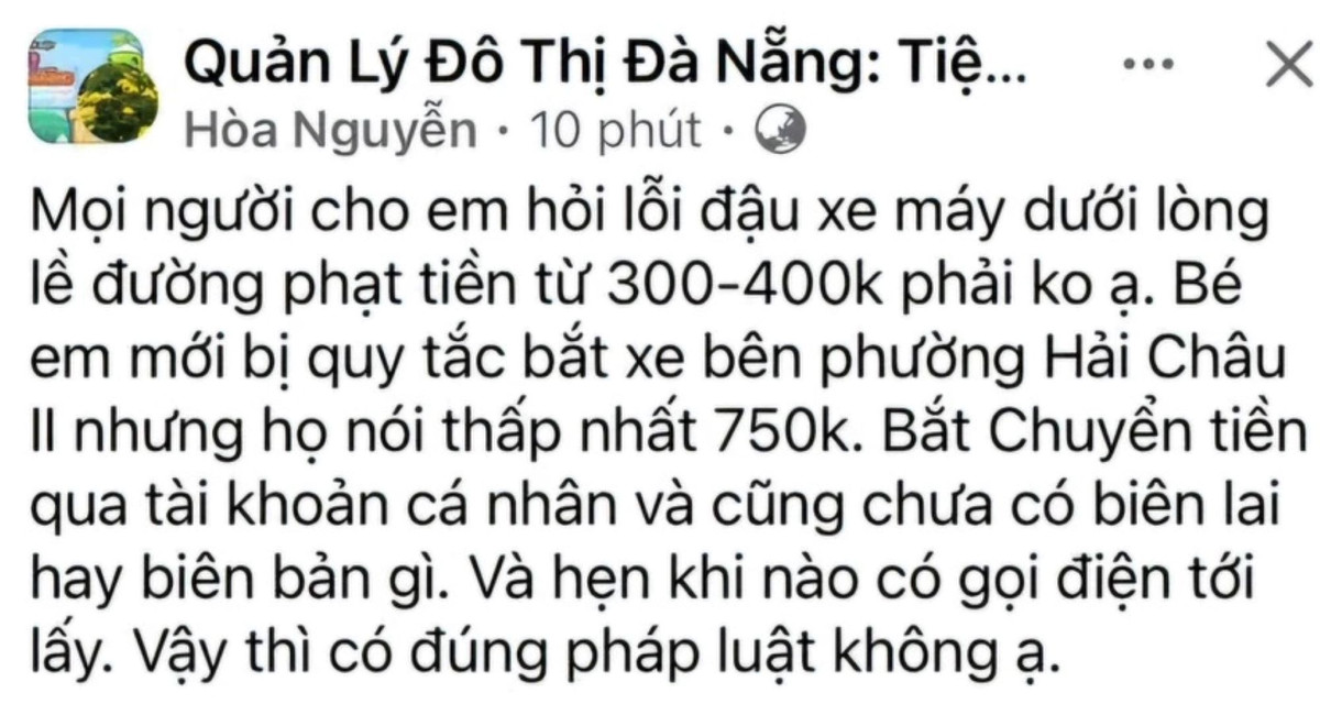 Ngày 11/12, UBND quận Hải Châu, TP Đà Nẵng có phản hồi thông tin viên chức thuộc Đội Kiểm tra quy tắc đô thị quận bị phản ánh thu tiền người vi phạm trật tự qua tài khoản cá nhân.