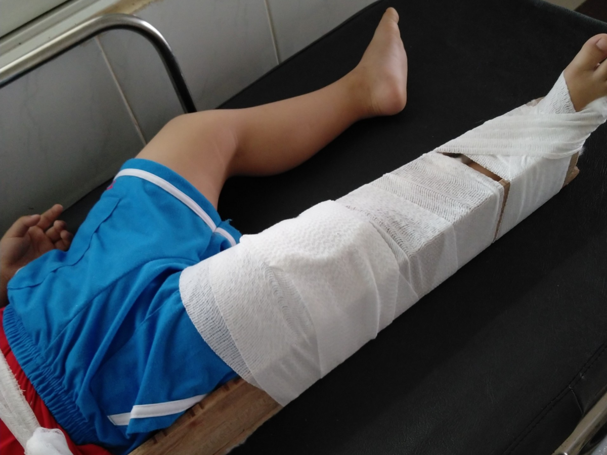 Hiện tại, bé P. đang điều trị ở Bệnh viện Nhi Đồng 1, TP.HCM. Trước mắt bé được kéo chân chờ bó bột, cần khoảng 2 tuần nằm viện, khi bó bột xong sẽ tập vật lý trị liệu trong thời gian dài.