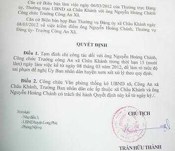 Theo ông Thành, ông Chánh là Thường vụ Đảng ủy xã Châu Khánh nên trước khi tạm đình chỉ công tác ông này Đảng ủy xã có tổ chức họp kiểm điểm sai phạm.