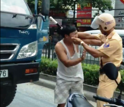 Hình ảnh trong clip cho thấy, CSGT đã túm cổ, đẩy và dùng dùi cui đánh thẳng vào đầu tài xế xe tải. Sau đó, cảnh sát này kéo tài xế về phía xe máy của mình rồi chỉ vào ống xả bị móp.